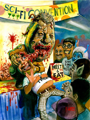 Fred makes appearances at high schools and colleges. Some of these have been at Collegiate in NYC, McDowell High School, Brooklyn School of Technology, The Pratt Institute, and Syracuse University. The National Caricaturist Network gave him the "Best Color Award" and has invited him to guest teach a color seminar at their annual convention. Recently, he painted the key art for the 10th anniversary of this year's Ozzfest'05. When you see that kid in the black concert T-shirt with the Ozzy demon sitting on the crapper, think of Fred... Boy, that didn't sound good did it!?